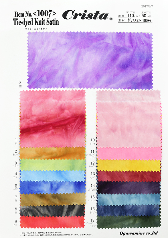 TIE-DYED : ムラ染め加工を施したニットサテンです。 サテンの光沢とニットのストレッチ性(1WAY)を併せ持つ、大変使いやすい素材となっています。