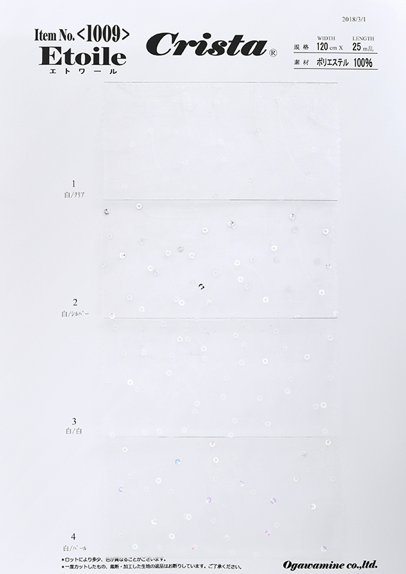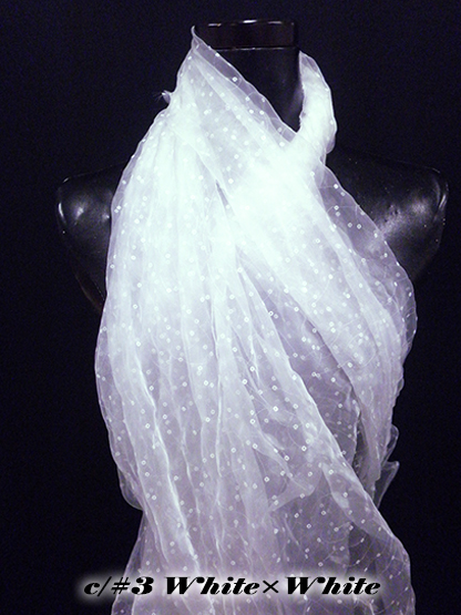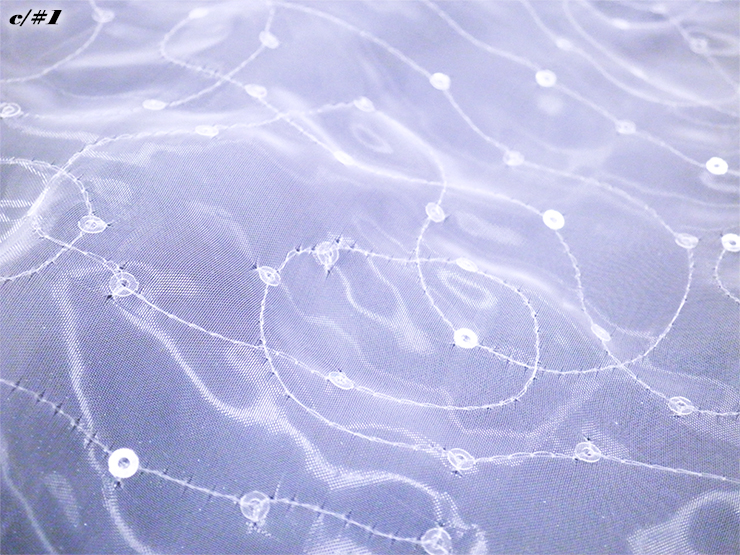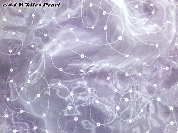 品番2023 グラスオーガンジをベースに直径約2mmのスパンコールを施した素材です。エトワール(星)のような煌めきを放ちます。ベースのオーガンジは白色となり、スパンコールはそれぞれc/#1クリア・ c/#2シルバー・ c/#3ホワイト・ c/#4パールです。