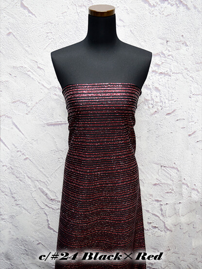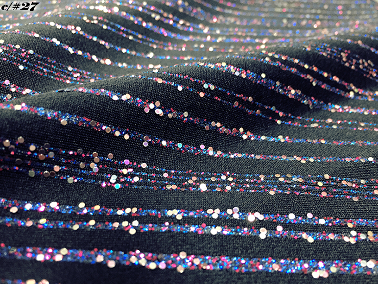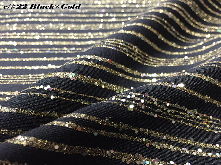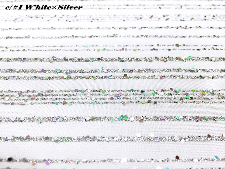 2WAYストレッチ素材をベースにサイズの異なる煌びやかなグリッターをランダムボーダー柄に施した素材です。
