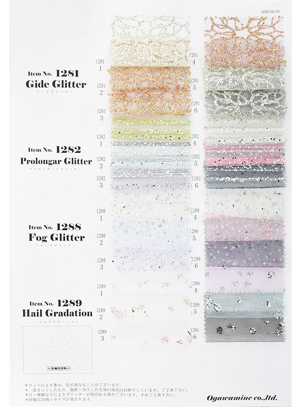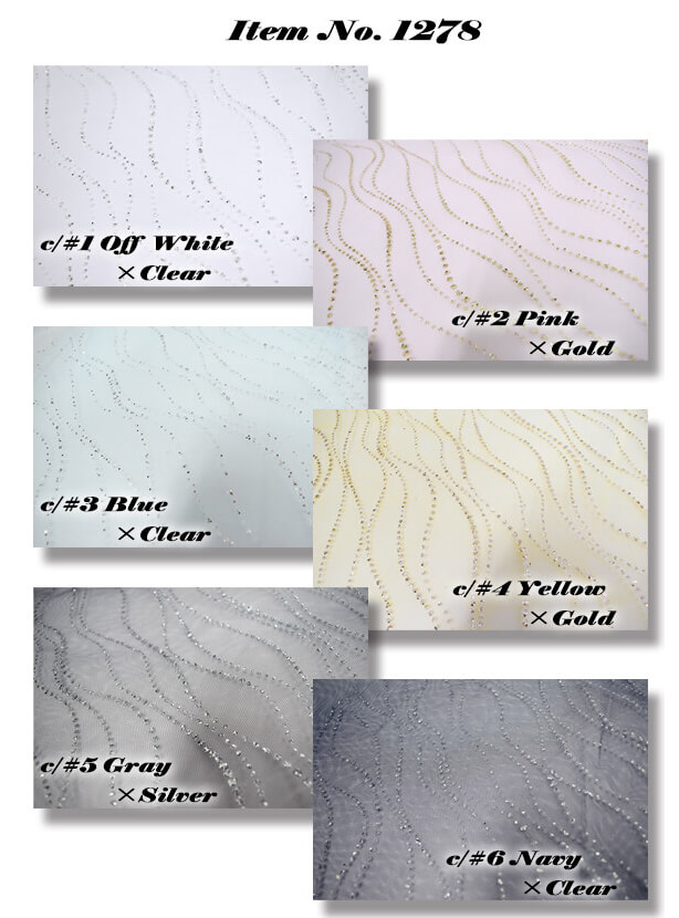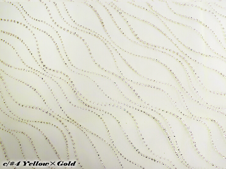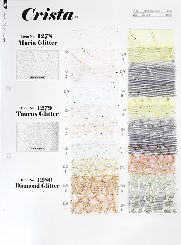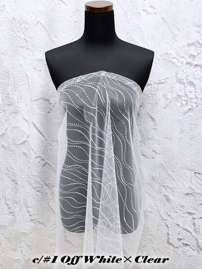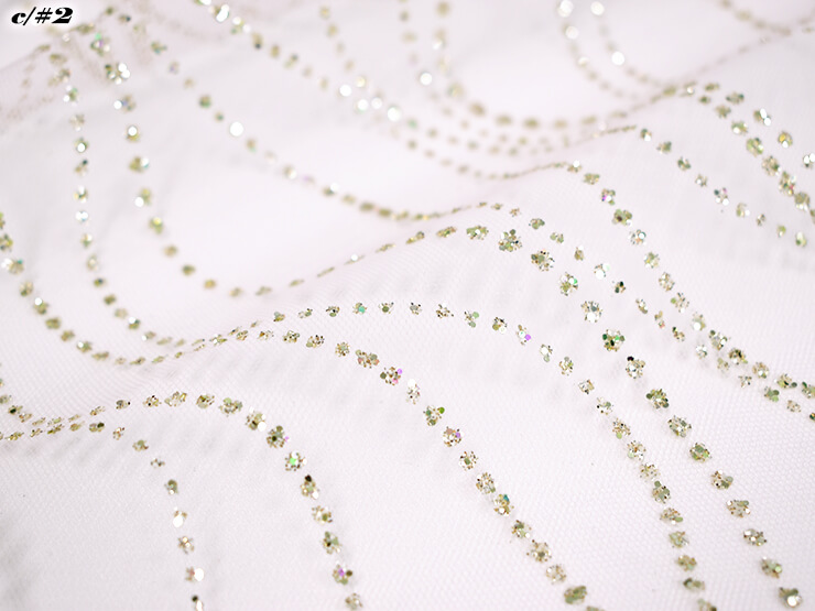 品番1000ハイゲージチュールをベースに大小のグリッターを散りばめた幾何学柄の素材です。大きいグリッターは特に光沢が強く華麗な輝きを放ちます。