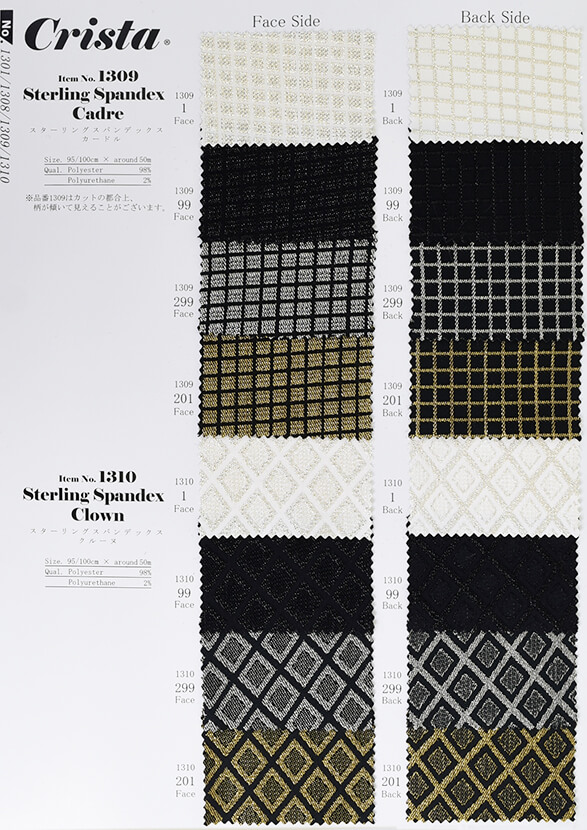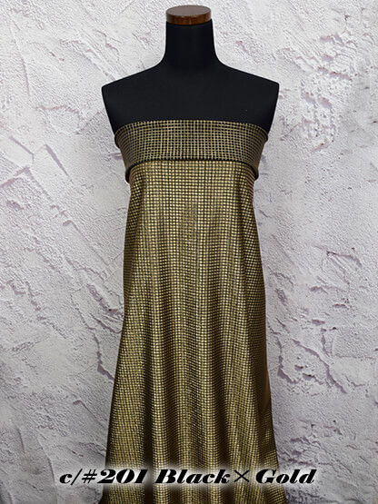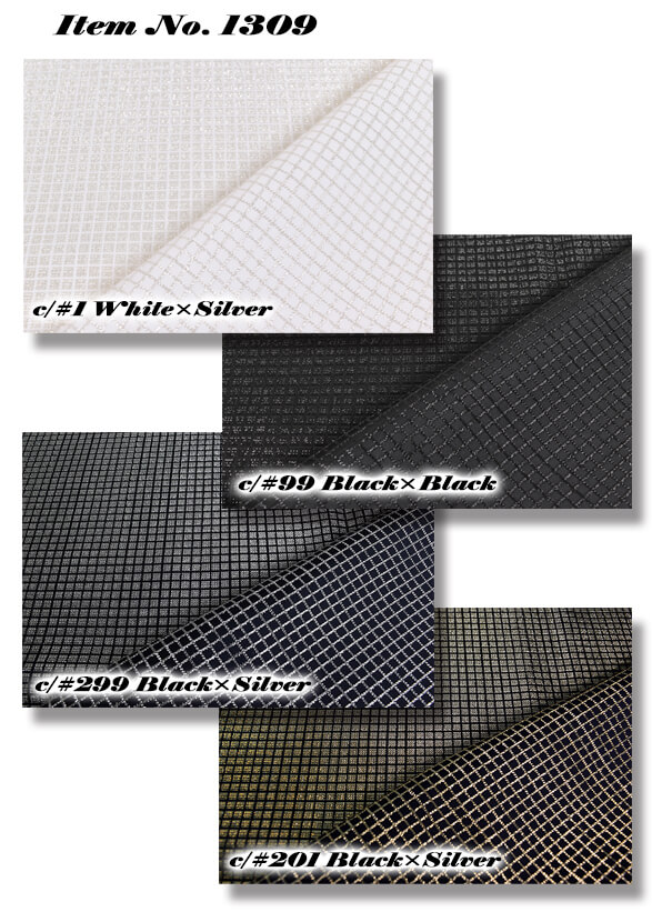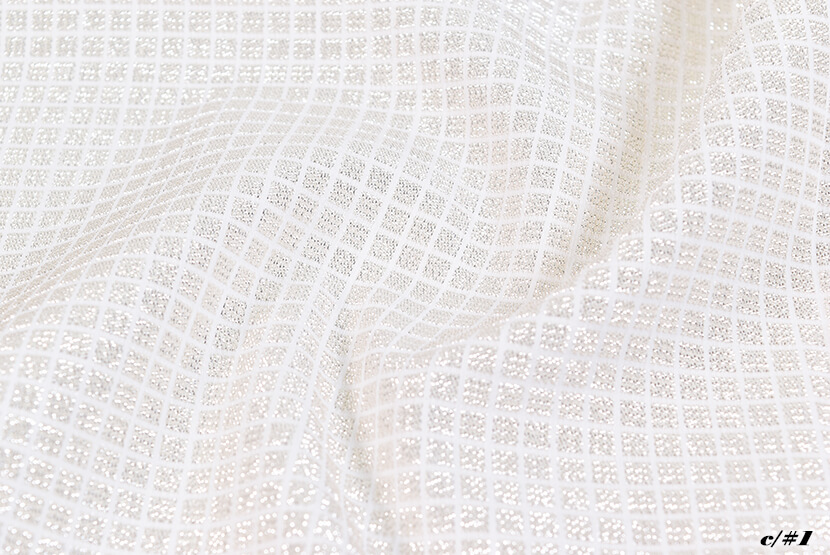 純銀のラメ糸による独特の光沢感と、ストレッチ性を兼ね備えた格子柄のラメ素材です。