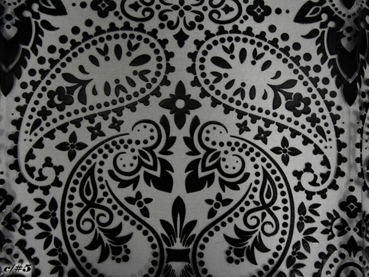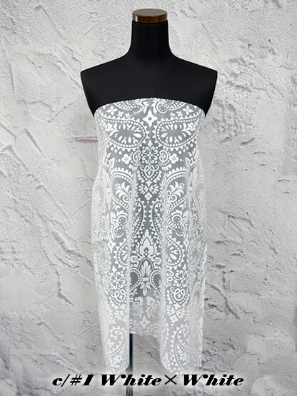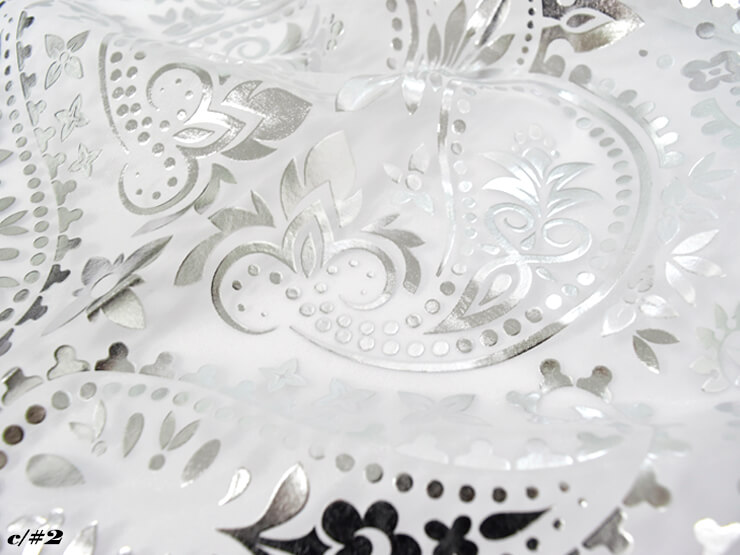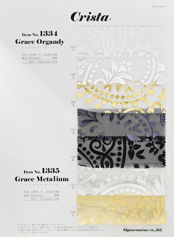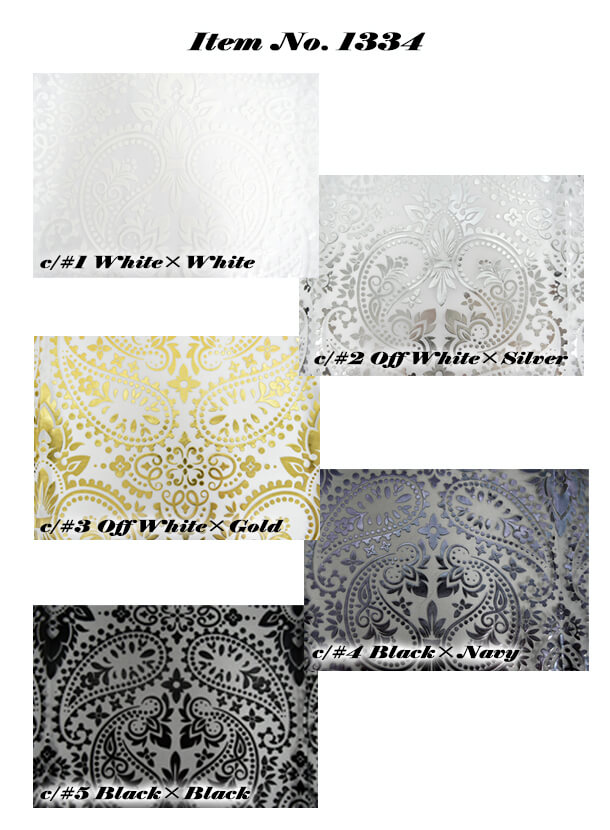 アラベスク柄の立体的な箔加工を施すことにより、オーガンジーの透け感が上品に際立つ商品となっています。