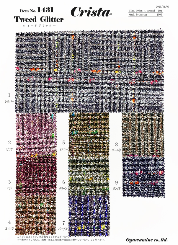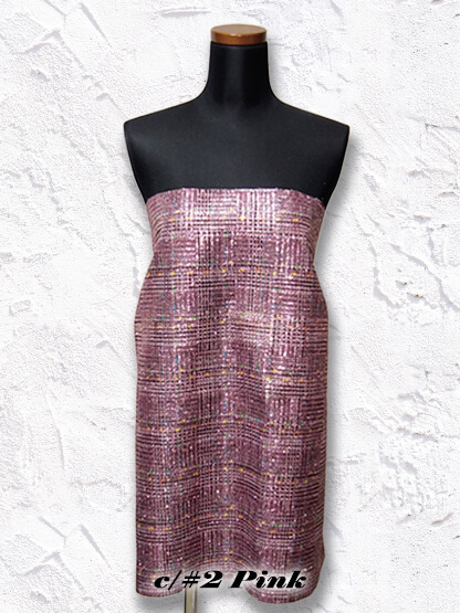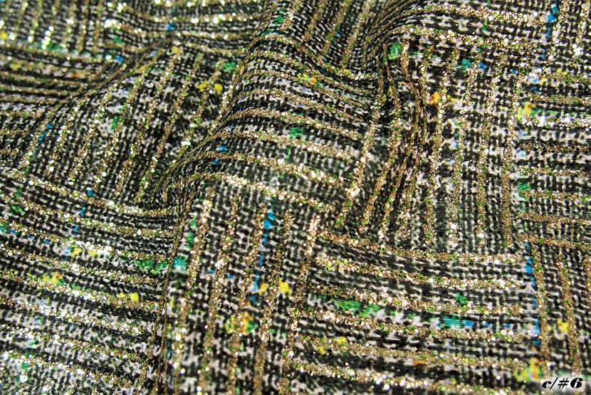 ツイード風のラメジャガードにグレンチェック柄をプリントし、大きさの異なるグリッターを混ぜて加工しました。 ※汗・摩擦などによりグリッターが剥がれる場合がございます。予めご了承ください。 ※ご注文の際はサンプル帳・店頭ハンガーなどによる現物での確認をお願い致します。