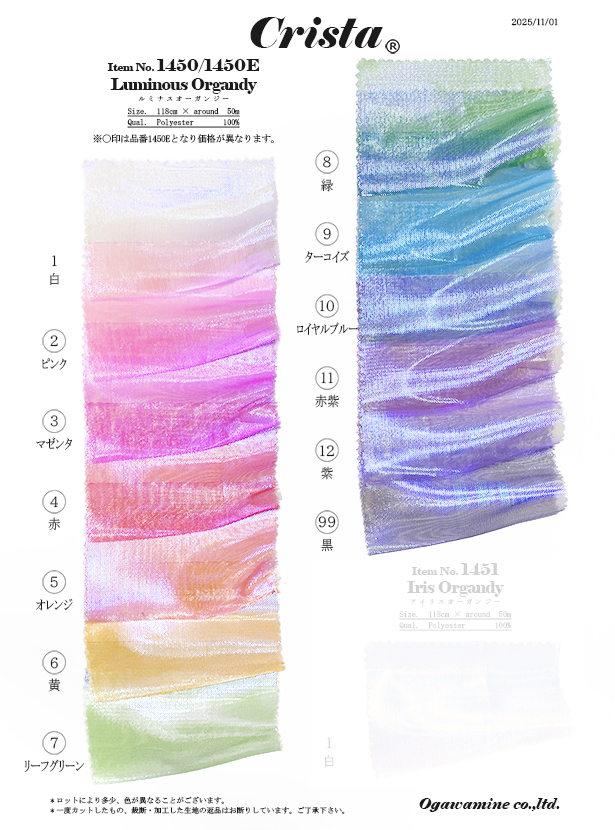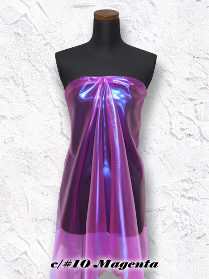 特殊なラメ糸を使用し、透明感の高い不思議な光沢感のテキスタイルに仕上げました。 また、角度によってブルーやパープルの光が見え隠れする、オーロラのような素材です。 ※ご注文の際はサンプル帳・店頭ハンガーなどによる現物での色確認をお願い致します。