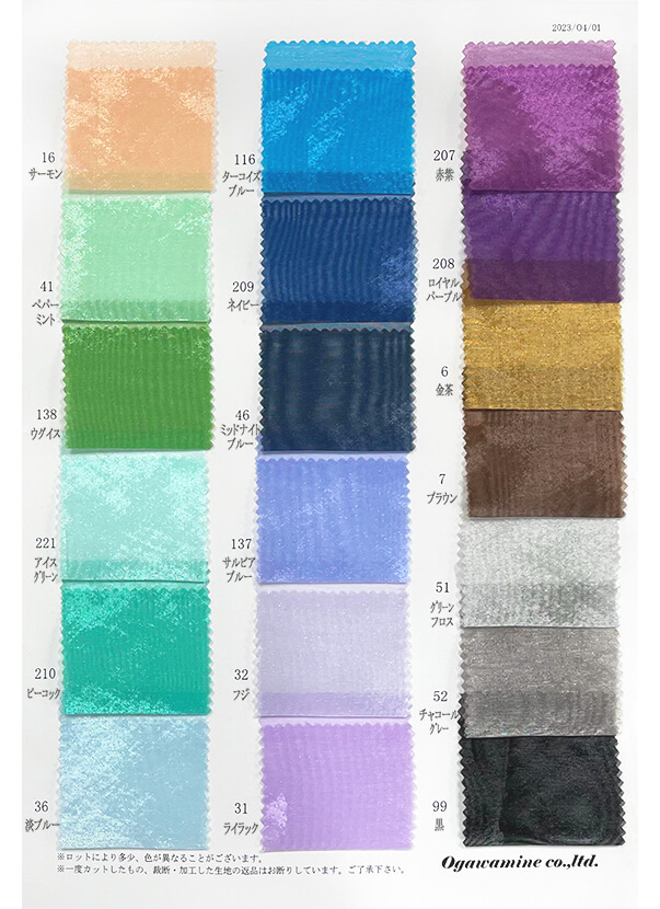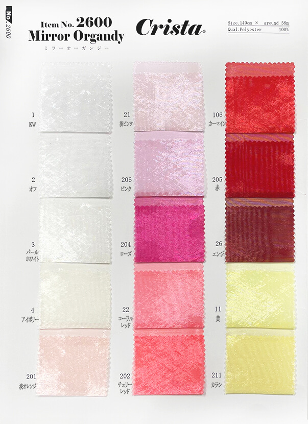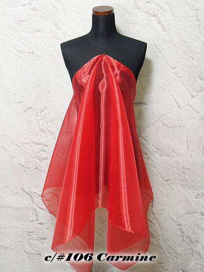 光沢の強さが際立つポリエステルのオーガンジーです。 ※ご注文の際はサンプル帳・店頭ハンガーなどによる現物での色確認をお願い致します。 ※生産上の都合により140cm巾の在庫無くなり次第、152cm巾へ移行致します。