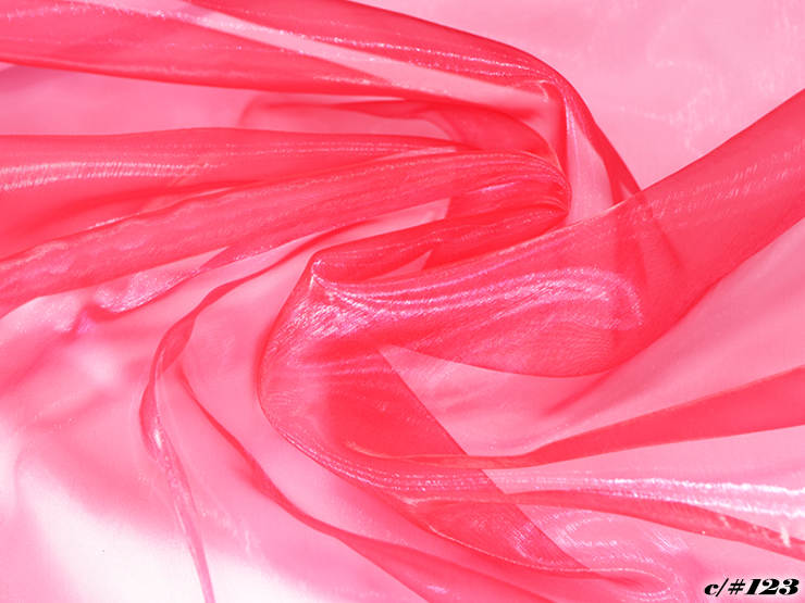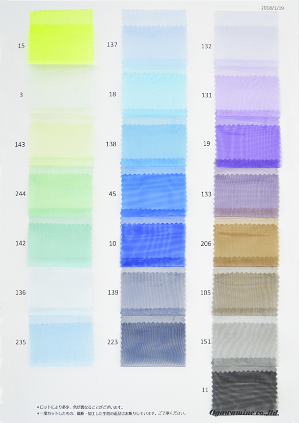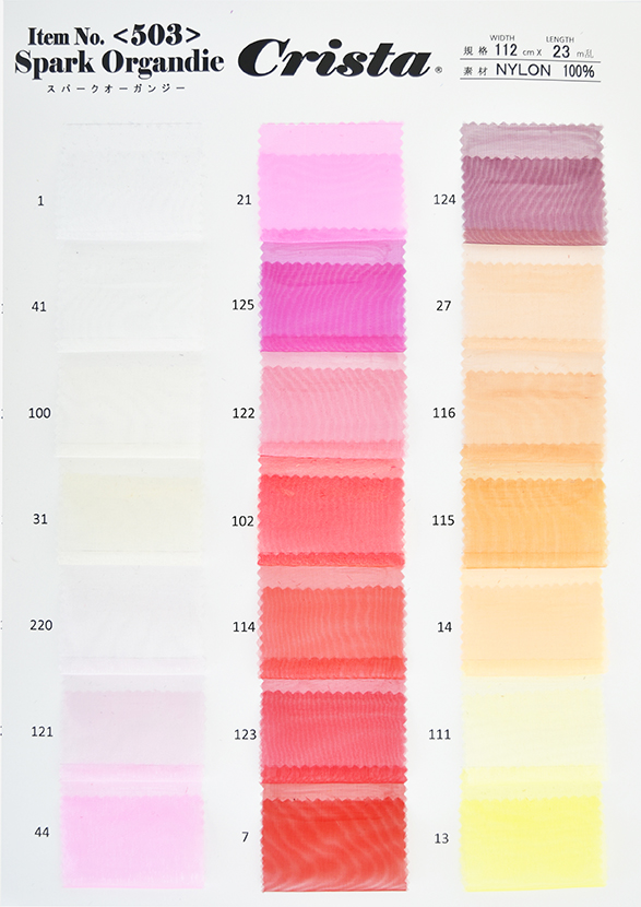 This is an organza made of spark nylon yarn. This material has more tension and a stronger luster than ordinary organza. It also has a beautiful color since it is the nylon.