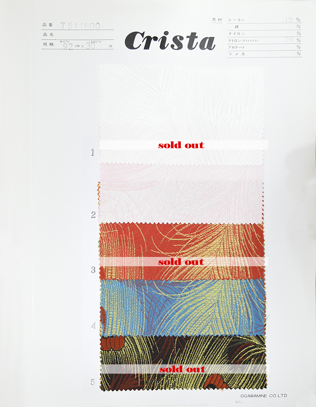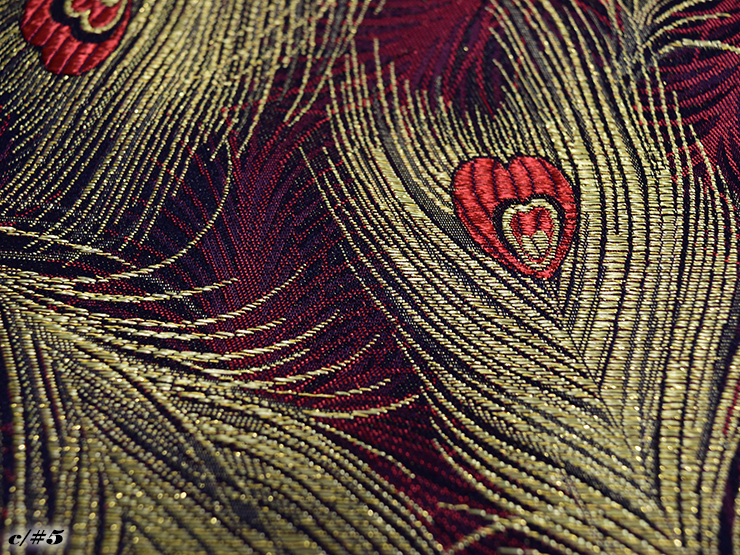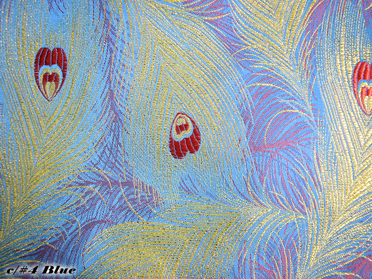 孔雀の羽をイメージした柄のジャガードです。 縦糸と横糸のカラー+ジャガード織にて複雑な柄を表現した、先染めの織物です。 チャイナドレスなどに使用されます。 ※廃番商品の為、在庫無くなり次第終了致します。