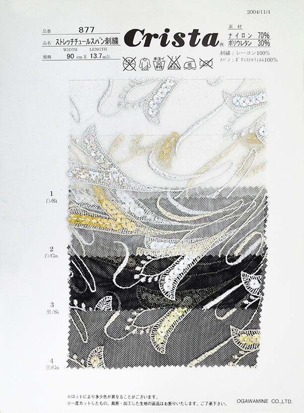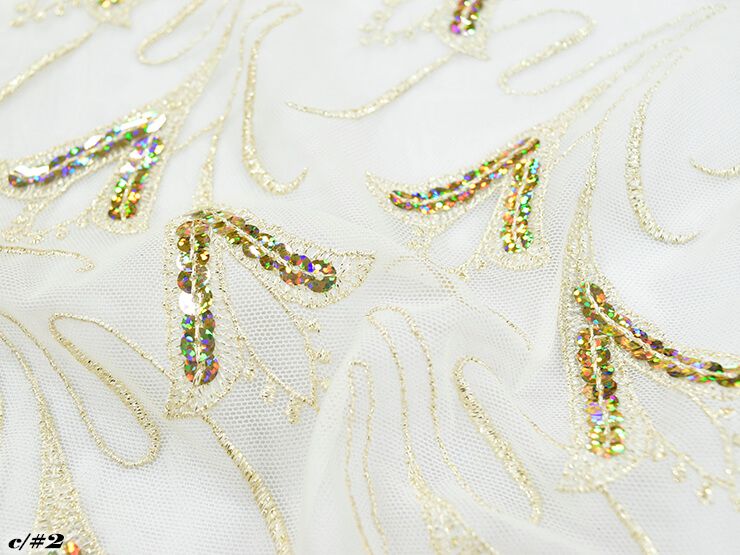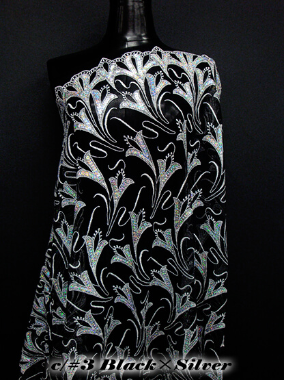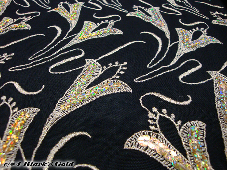 ストレッチチュールにラメ糸とホログラムスパンで豪華な刺繍を施した素材です。 両耳にはスカラップがついています。 ※廃番商品のため、在庫無くなり次第終了致します。