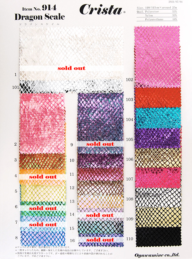 913クラッシュベルベットにドラゴンの皮膚(うろこ)をイメージし、箔加工を施した素材です。1~16番色は方向によって色が変わる独自の偏光フィルムを使用しています。