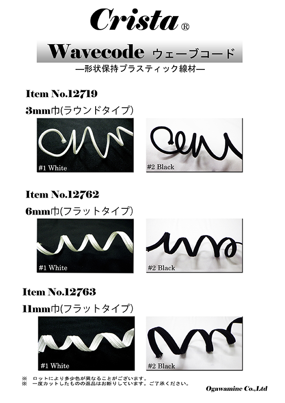 6mm巾、フラットタイプのウェーブコードです。 芯に形状保持プラスティック線材を使用しています。 ご自由にウェーブやラインを作れる便利な芯です。