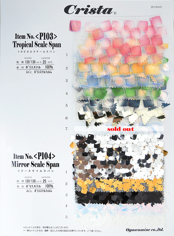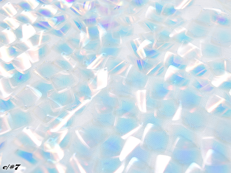 チュールにスクエアのスパンコールを重ねて縫い付けた素材です。角1ヵ所だけの縫い付けの為、スパンが動き躍動感があります。