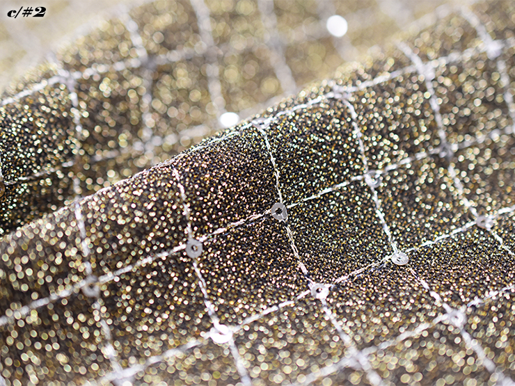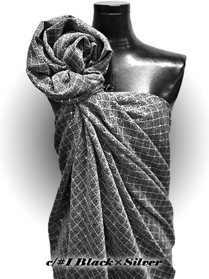 各色黒ラメ糸×シルバー/ゴールド/黒のラメニット素材をベースに、格子状にスパンコールを刺繍した素材です。 ラメ生地に華美過ぎないスパンコールの上品な輝きが高級感を演出します。 ※生産上の都合により、在庫無くなり次第100番台へ移行致します。