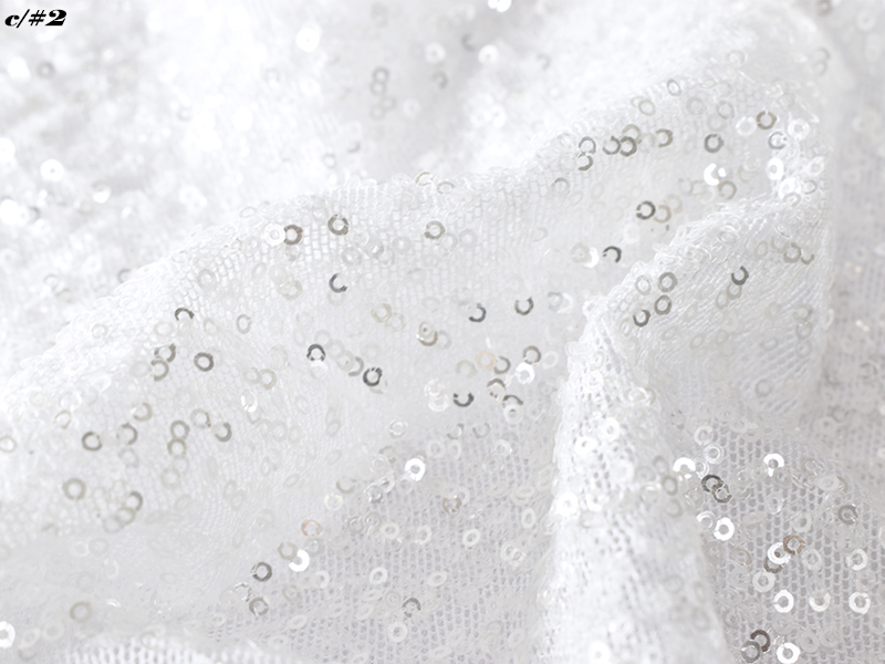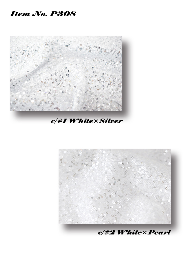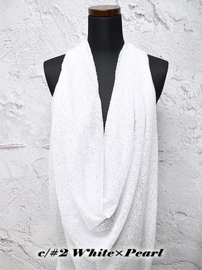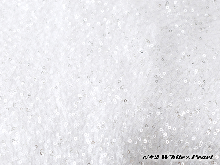ストレッチチュール素材をベースに直径約2㎜の小さなスパンコールをランダムに全面刺繍した素材です。様々な方向から輝くスパンコールが印象的です。