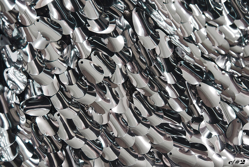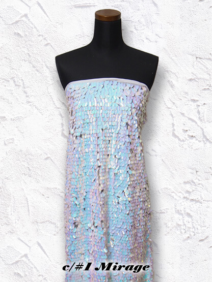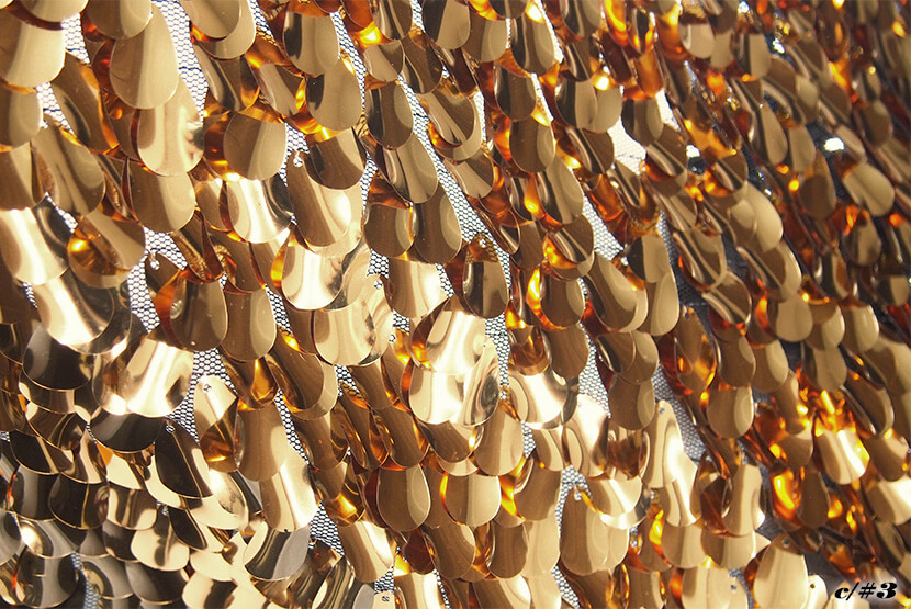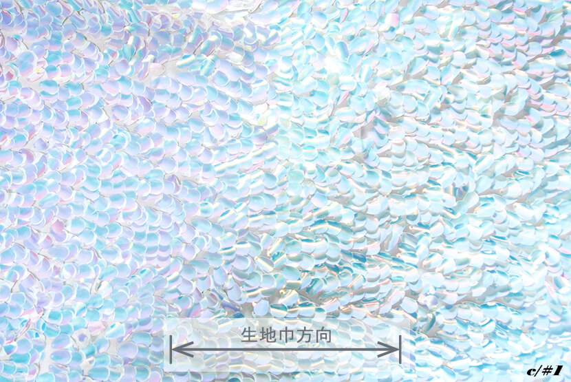 タテ約18mmのドロップ型スパンコールを刺繍した素材です。湾曲したスパンコールが特徴的です。
